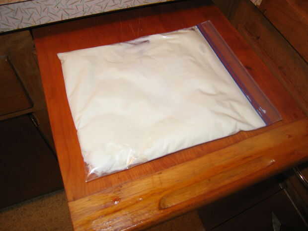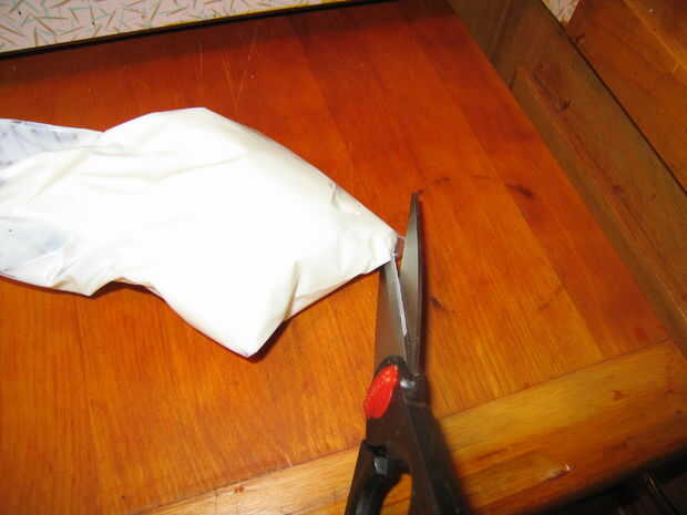 Crujir la parte "vacía" y mientras sujeta firmemente, pero no presionando duro, cortar un pequeño rincón frente a la punta de la bolsa donde está el yogur.