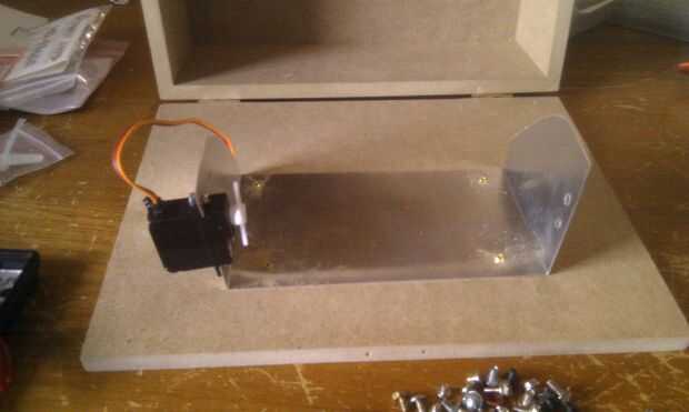 Monte el marco externo del mecanismo de inclinación (que se hizo en el paso anterior) en el interior de la tapa superior. Aquí la parte más difícil es encontrar unos tornillos que fueron lo bastante pequeños como para no meter a la parte superior de la caja. No pude encontrar ninguna en la sección del tornillo en Bunnings, lo que hice fue mirar las bisagras, hubo bisagras de latón decorativo pequeño que vino con tornillos pequeños, estaban barato bastante yo estaba feliz de deshacerse de las bisagras y conserve los tornillos.