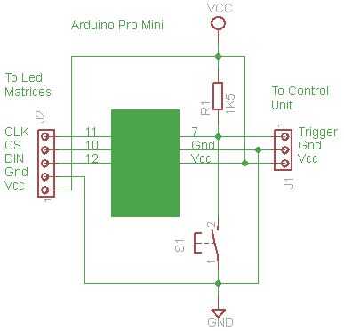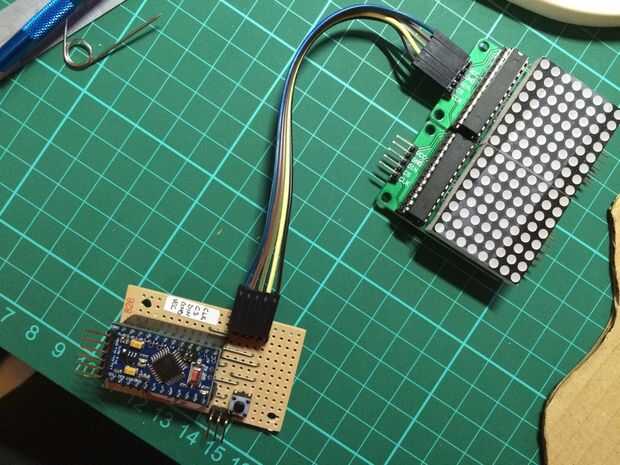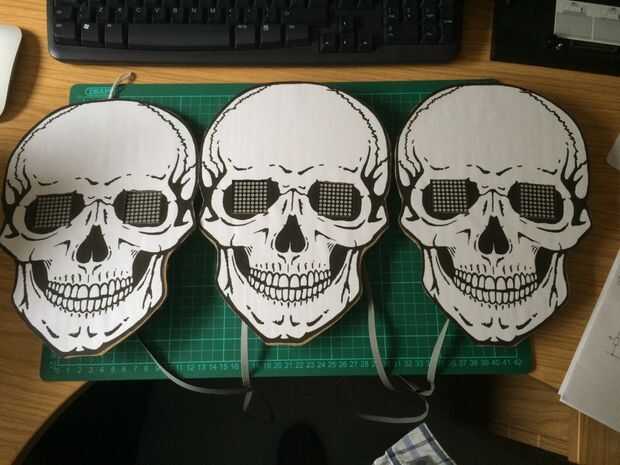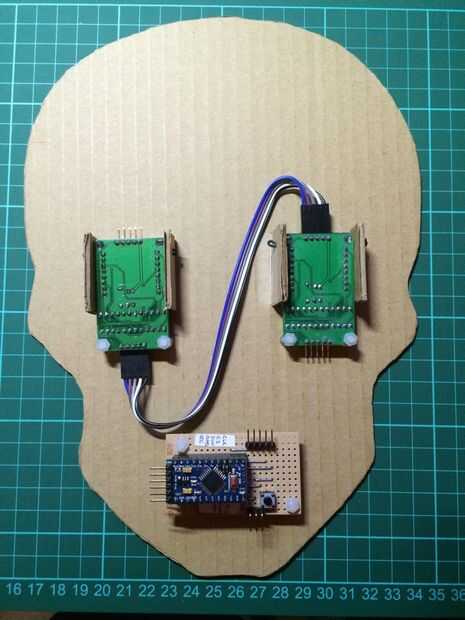 Para hacer las máscaras cráneo animados utilicé los tres conjuntos de ojos malvados del proyecto anterior y portado el código de un Arduino Uno a un Arduino Mini Pro para reducir el factor de forma y bajar el peso que estas máscaras tendría que ser la ventana montada en tazas de la succión. Las matrices fueron interconectadas con cable de cinta, otra vez para mantener el peso. El código fuente original fue modificado para pausa/reinicio en una señal de disparo enviada al pin 7 a través de un 1K 5 tire para arriba del resistor. A continuación se incluye el código para que en HalloweenEvilEyes.zip. Detalles del diagrama del circuito también son mencionados.