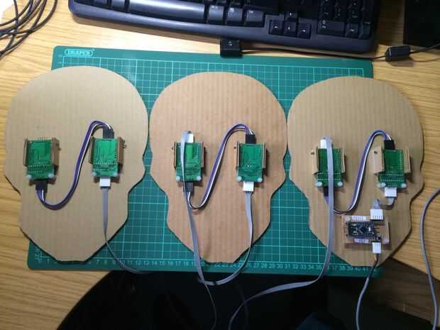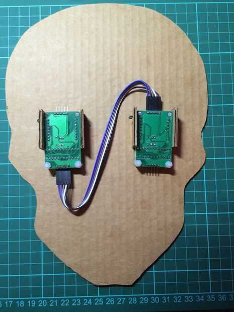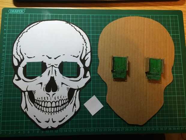 Aperturas para las matrices de formado para alinear con las tomas del cráneo y sujetados a la máscara con separadores de plástico de 10 mm M3. Estos se atornillan al cartón utilizando tornillos de cabeza avellanada de nylon para no desplazar la imagen del cráneo. Para detener la cada matriz de 'flopping' remite como se fijaban solamente en la base de cada PCB un pequeño trozo de alambre de jardín fue alimentada por la izquierda y derecha, ubicar las piezas sobre el PCB y en el conector molex.