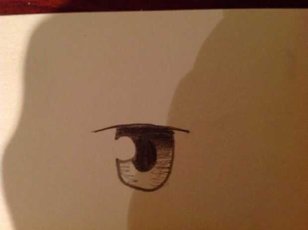 Empezar a sombrear el ojo. Iniciar muy oscuro en la parte superior y se desvanecen a medida que avanza hacia abajo. NO SOMBRA EN EL PUNTO LIGERO! Terminar con no o apenas sombreado directamente debajo de la pupila.
