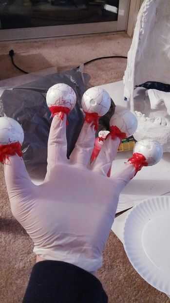 utilizando un tubo de campana de viento (el dispositivo semi-finger-formado solamente pude pensar) empujó hacia fuera de los dedos del guante, poner pegamento en el agujero del globo ocular y pegado encima de los guantes de látex. (No lo esta con su mano dentro) después de que fuera robusto y pegada, pasé el pegamento en y alrededor de cada globo ocular como el goteo de sangre pegajosa. después de secar, pinté el pegamento rojo.