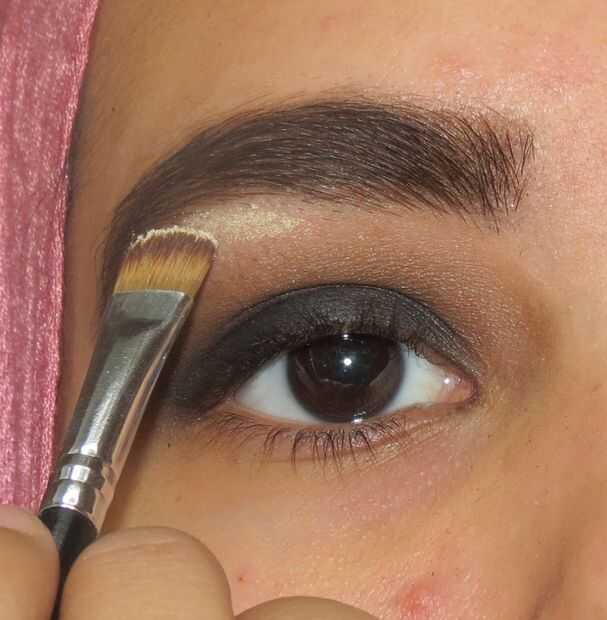 con un pincel plano aplicar una sombra de ojos brillo color perla en el hueso de la ceja. Estoy usando la sombra media inferior que se muestra en la imagen.