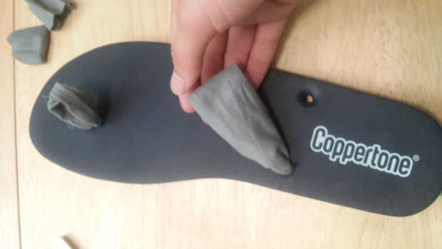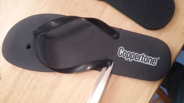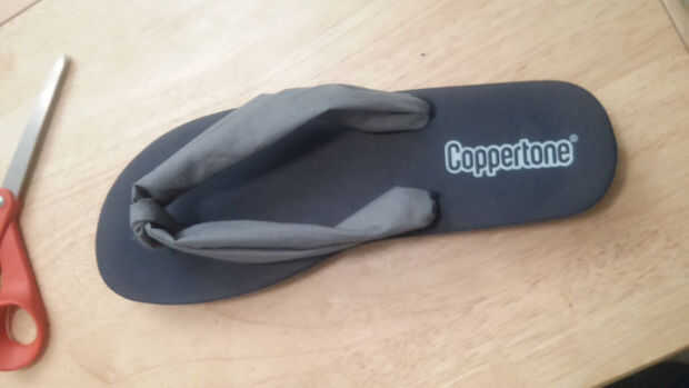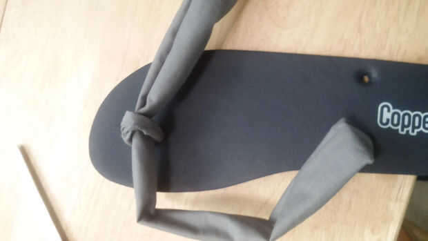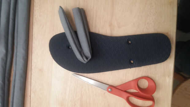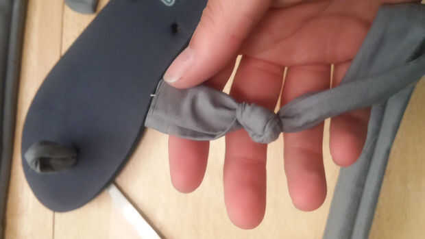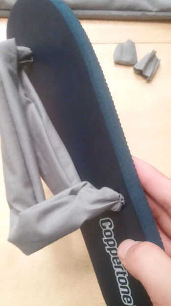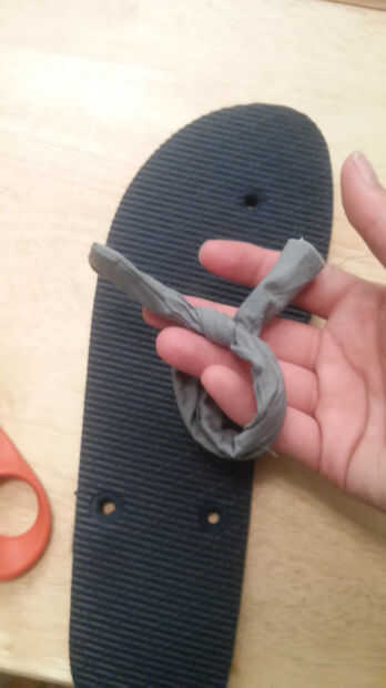 Una vez que la tela es totalmente alimentada a través de, un nudo en el otro extremo de la tela. Esto se sujetan las correas y mantenerlos en la suela del zapato