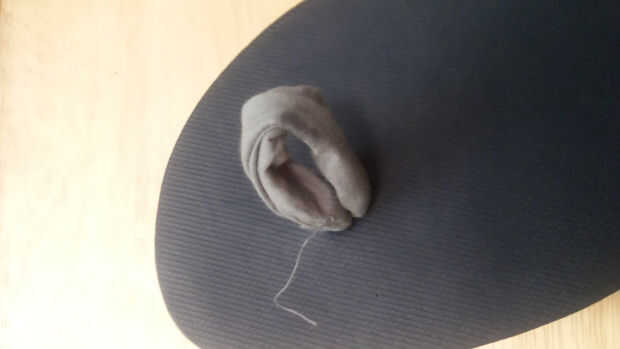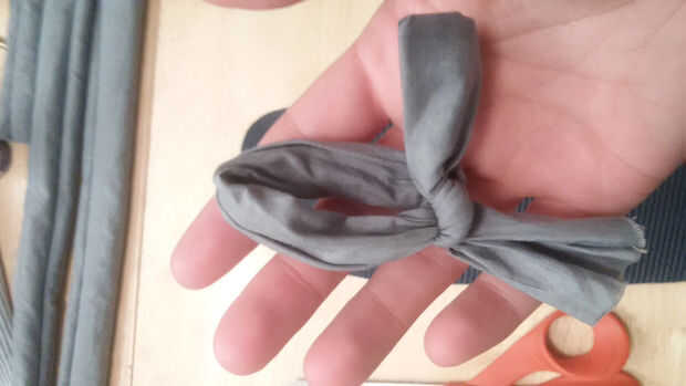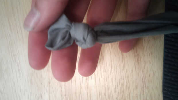 Luego tomar uno de los 12" pedazos de tela y lazo los dos extremos juntos para formar un bucle. Asegúrese de que el nudo está apretado.