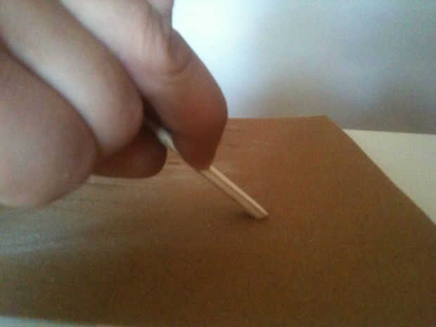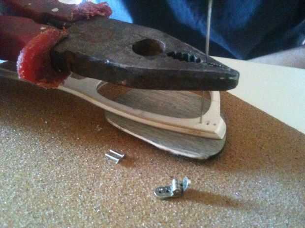 Compruebe sus bisagras. Si tienes algo como el de la tercer foto aquí, entonces todo lo que necesitas hacer es usar la aguja para hacer dos agujeros en los palillos de metal sería. Y luego unir las dos piezas de metal.