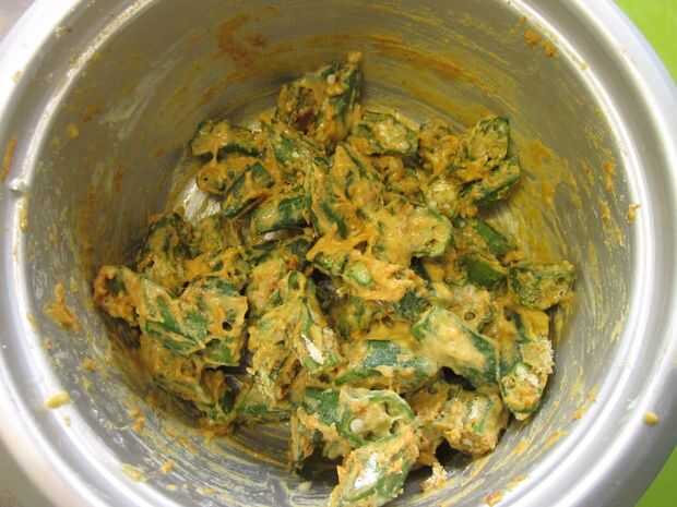 Seguir añadiendo una cuchara de harina de Chicpea en un momento la Okra y mezcla. Añadir agua si usted piensa que la mezcla está demasiado seca, una cuchara a la vez. No necesita demasiada agua. Guardar ajuste de harina y agua hasta obtener una buena capa. Desea una capa ligeramente pegajosa.