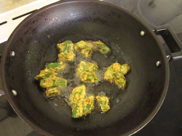 Prueba el calor del aceite mediante el uso de una sola pieza de okra. Debe flotar y empezar a chisporrotear.