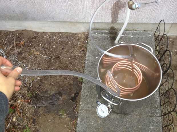 Entonces tan pronto como sea posible, que usted quiere enfriar el mosto a temperatura ambiente, yo dispare sobre 70F. Hago esto con un enfriador de mosto conectado a una manguera, pero mucha gente sólo encestar su hervidor de colado en un cubo de hielo. Hice esto durante un tiempo y no es muy eficaz. Enfriadores de hierba son bastante baratos hacer, voy a intentar poner una sección en lo que uno en un momento posterior.