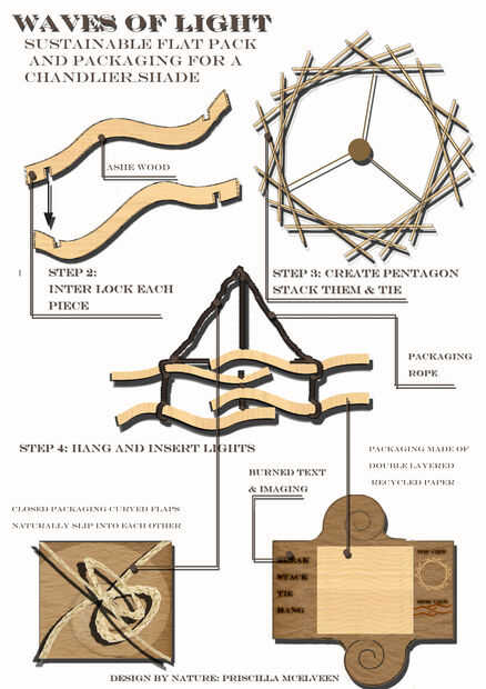Envases están elaborados con papel reciclado y en lugar de adiciones de tinta para obtener instrucciones, todos los textos e imágenes han sido quemados en el embalaje. Recuperada de la cuerda hecha de fibras naturales de sisel ayudan a colgar el producto y añadir un efecto decorativo en el embalaje.