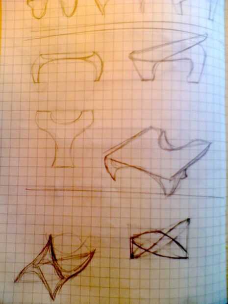 El primer paso fue salir de un lápiz y empezar a dibujar. Jugaba con un par de ideas antes de instalarse en la una en la parte inferior de la página. La idea básica era un plano distorsionado, con tres puntos de contacto con la superficie del escritorio y tres puntos de golpear la parte inferior del portátil. La vista lateral (a la derecha) muestra cómo todo debe ser exprimido para la computadora portátil del ángulo.
