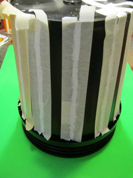 Añadir las rayas: Una vez seca la capa negra, pintar doce uniformemente espaciados, blancos "pinstripes" alrededor de los lados del cubo. Cinta de enmascarar es súper rectas; objetivo es hacer que aproximadamente 1/8" de espesor.
