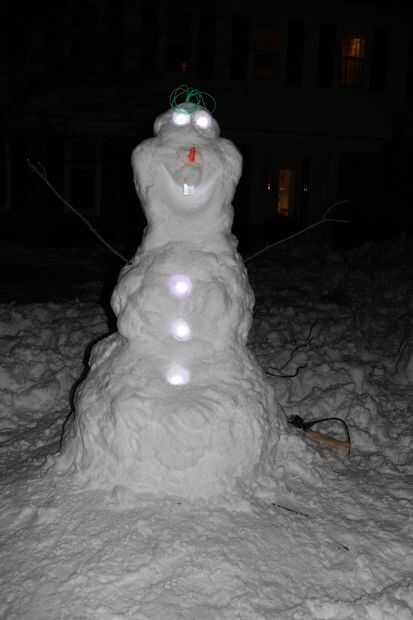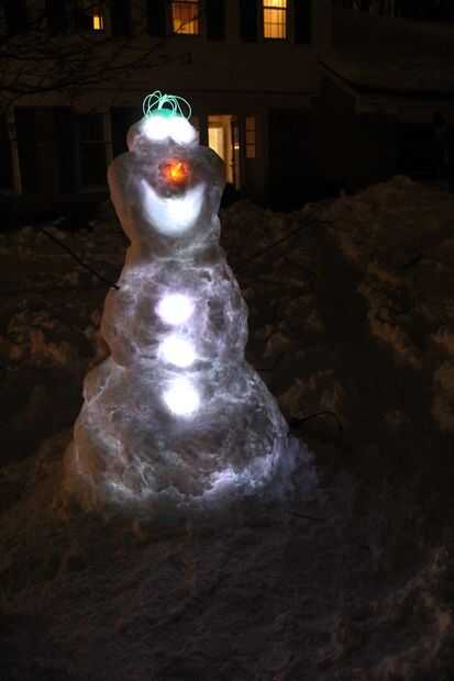 La parte superior dos luminarias sirven como los ojos de Olaf. Un círculo pequeño de cinta aislante negra encima de las luminarias sirve para los alumnos de la Olaf. También se exponen estas dos luces y hacia fuera.