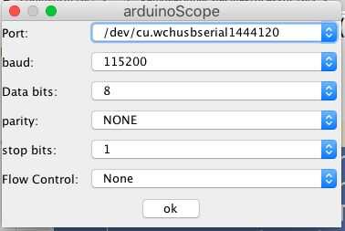 Para descargar las ondas en la ram de la arduino, necesitará configurar la comunicación serial. Si esto no se ha hecho antes, se aparece un cuadro de diálogo que permite fijar la velocidad en baudios (8-N-1) control de flujo se controla mediante la conexión USB. Una buena tarifa confiable es 115.200 baudios.