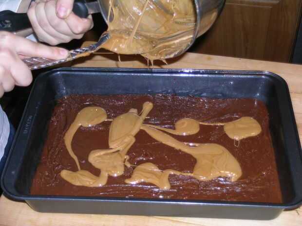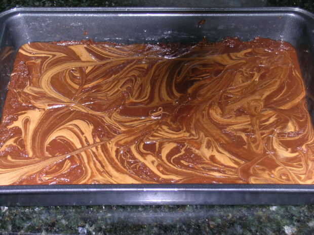 Vierta la melcocha sobre fudge, luego en remolino. Tenga cuidado de no sobre mezclar.