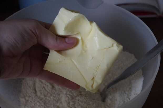 mezclar la mantequilla en la masa. La mantequilla puede venir directamente de la nevera: las manos rápidamente se calienta y hacer fácil trabajar con. Cuando la mantequilla, la harina y el azúcar se combinan en una masa agradable y suave, poner en el refrigerador para refrescarse un poco. Por el momento puedes empezar con el relleno de limón!