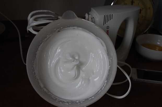 Mezclar las claras de huevo y azúcar hasta que esté espesa. Si usted puede dar vuelta el bol con la mezcla hacia abajo - sin que caiga, entonces está listo.