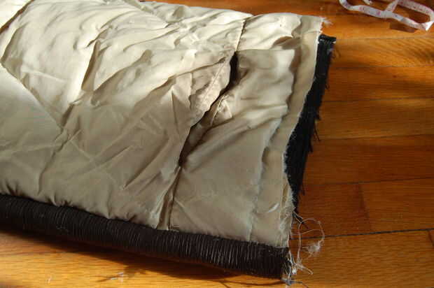 Coloque el lado derecho de la tela contra el interior de la guarnición (es decir, el lado de la guarnición que se tocarán las manos cuando se utiliza el manguito). Coser el forro y la tela Junta aproximadamente 1/4" a 1/2" del borde del lado largo del rectángulo.