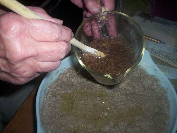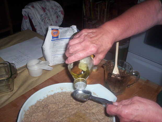 Agua, azúcar, sal y semillas de alcaravea se combinan juntos en la taza de medición, mezclar bien y añadir a la mezcla de la esponja. Batir bien. Añadir el aceite y la harina hacer una masa firme. Ponga la masa en placa espolvoreada con harina pan. amasar bien, agregar más harina, si es necesario para hacer una masa firme. El tazón de fuente grande del aceite y coloque la masa en el recipiente. Cubrir con la toalla y coloque en un lugar cálido a elevarse, alrededor de 1 hora.