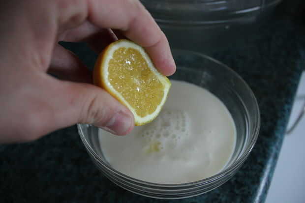 ** Si no tienes suero de leche, puede utilizar una leche con una cucharada de jugo de limón como aquí. También se puede utilizar crema diluido con un poco de agua, o incluso yogur. Desea un producto lácteo para la riqueza y que sea lo suficientemente ácido para activar el bicarbonato de sodio.