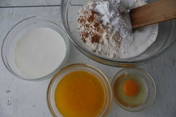 Añadir los ingredientes húmedos a secos y mezclar con una espátula de goma grande, hasta que se juntan.