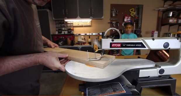 Vas a tener que cortar la Junta siguiendo el patrón que usted sólo trazada en la parte superior. Puede utilizar un número de diversas herramientas para ello. Si tienes una sierra de banda, sería perfecto. En este Instructable usé una sierra que puede ser tenida por menos de $100 en su tienda local de caja grande. También se puede utilizar una sierra caladora o un serrucho si no tienes ninguna herramienta de poder.