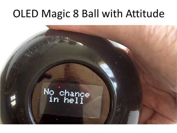 El juguete de Magic 8 Ball ha introducido en 1950. Responde sí o no preguntas a través de un dado echado a un lado 20 flotando en el líquido azul oscuro - lado flota en la parte superior es la "respuesta". En este proyecto que el mecanismo mueren y el fluido se sustituye con un OLED pantalla y basados en Arduino microcontrolador.