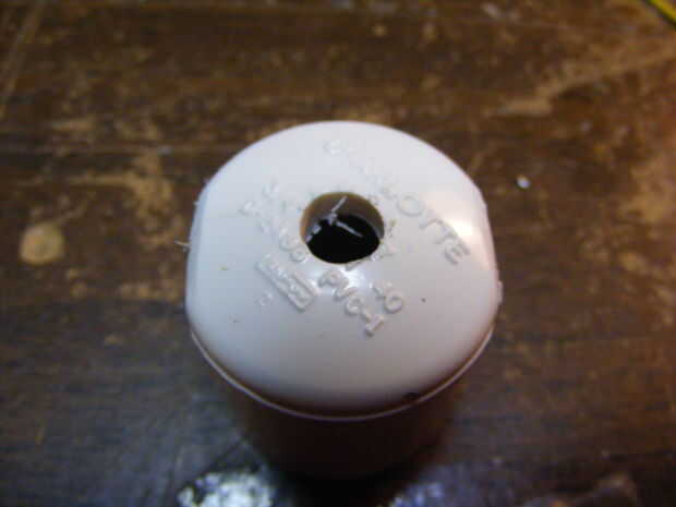 a) Perfore un orificio de 5/16 de pulgada centrado en la parte superior del casquillo de extremo de PVC de 3/4"- el interruptor de flotador se instalará más tarde en este agujero. También presentar dos áreas planas en los lados opuestos de la tapa para proporcionar superficies de montaje plana buena para batería LiPo y Flora a ser instalado después