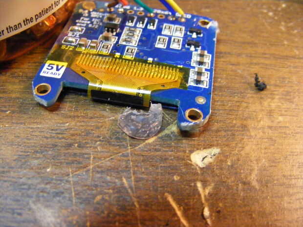 b) usando el plástico Dremel corta rueda, ajuste nuevo OLED orejas de montaje como se muestra en la foto, esto es necesario para que encaje correctamente dentro del puerto de vista de la 8 bola al instalarlo más tarde.