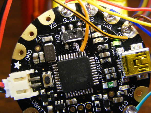 b) lo más difícil para la soldadura de conexión está en la Flora a bordo encendido/apagado interruptor medio dentro de pin. Comenzar agregando una gota adicional de la soldadura al perno, con soldadura de estaño el alambre de conexión y finalmente colocar el alambre estañado sobre el pasador del interruptor y usar el soldador para derretir la soldadura para hacer el empalme.