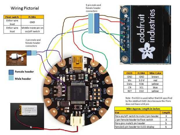 una) te recomiendo comenzar este paso revisando primero la pictórica de cableado y las fotos. Sólo hay 7 conexiones para hacer: 2 entre la Flora y el interruptor de flotador y 5 entre Flora y pantalla OLED.