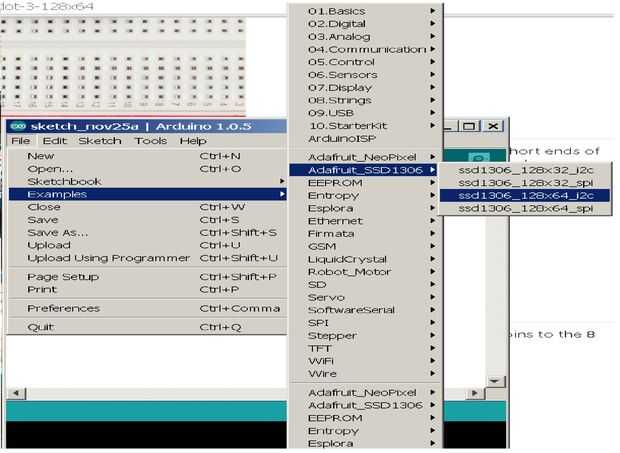 Con eso hecho, usted puede probar la pantalla OLED, el IDE de Arduino: archivo > menú ejemplos navegar hasta el código de ejemplo llamado "sdd1306_128x64i2c" (ver foto para ayudarle a llegar allí). Por desgracia el código no funcionará como es, tendrá que buscar la linea: