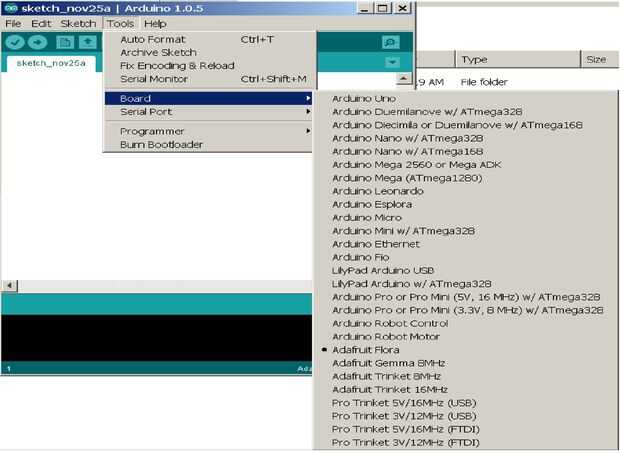 Debido a que la Flora no es una placa Arduino estándar como el Arduino UNO, necesitará instalar el "salsa especial Adafruit" menú de opciones de software que agrega Adafruit Flora a la Junta de programación de Arduino IDE (ver foto). También se requiere es instalar el controlador de dispositivo de Flora. Ayuda con todo esto es proporcionado por el Adafruit para empezar con la guía de Flora, vea el enlace a continuación: