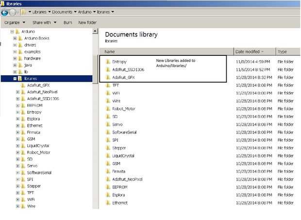 La sección Ardunio biblioteca y ejemplos de la guía explica cómo descargar e instalar las 2 nuevas bibliotecas (Adafruit_SSD1306 y Adafruit_GFX).