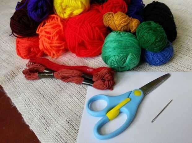 3. Hilos azul, verde, rojo, amarillo, negro, escarlata, naranja, oro.