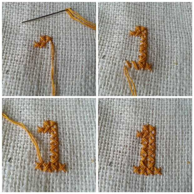 Primero Cruz había cosida el número '1' con 2 hebras de hilo de oro del ganchillo. Inicia desde la parte superior, Cruz había cosido a la mitad de la parte recta, había terminada la parte inferior y otra vez Cruz había cosida a mi manera hasta completa la segunda mitad de la parte recta.