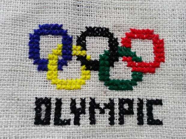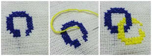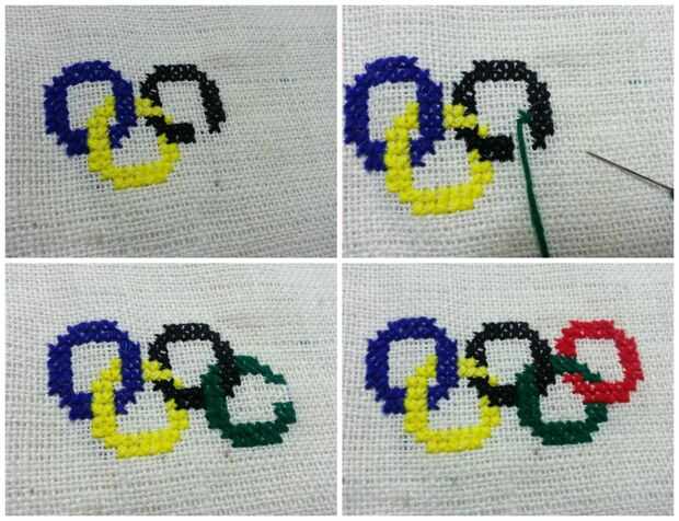 Primero Cruz cosida el anillo azul, entonces el anillo amarillo seguido por el anillo negro, verde y rojo.