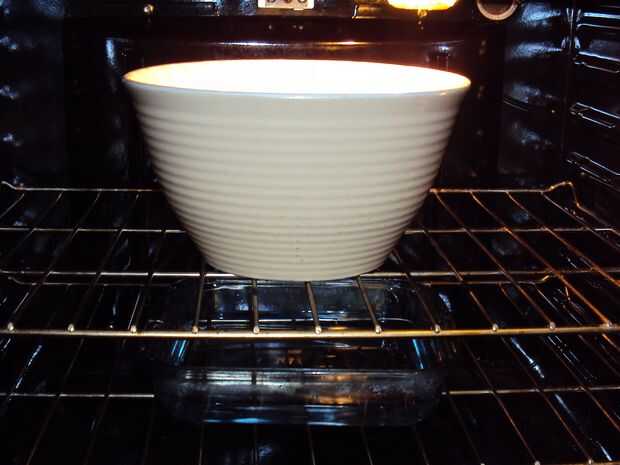 Mi cocina es demasiado frío, lo caliente de mi horno (sólo hasta que llegue a 170° F) y lo apaga. Entonces, puse un plato de agua caliente en la parrilla inferior y el recipiente con la masa en la rejilla superior. Esto mantiene todo lo agradable, cálido y húmedo. (Es importante recordar apagar el horno!)