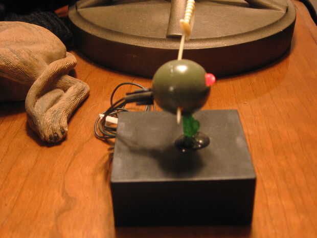 Cabeza de Olive Man es una pequeña bola que encontré en el patio trasero que pinté verde oliva. Había montado en el cuerpo de una figura de alien. He logrado esto a través de una de mis técnicas mod figura favorita. Usar un punzón para empujar los agujeros en las piezas que quiero unir y luego utilizar una parte del clip de papel como soporte. A continuación añadir un poco de pegamento para mantener Unidas.