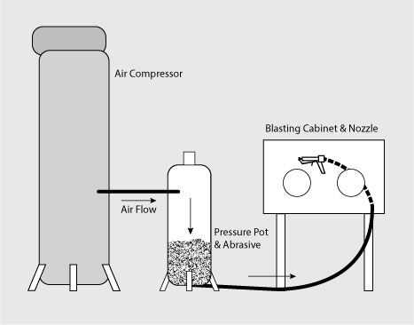Aquí se ilustran los conceptos básicos de chorreo de arena. El compresor de aire empuja el aire a la olla de presión, mezcla con el material abrasivo, que luego se proyecta a la cabina de granallado. Algunos detalles se han quedado para simplificar la explicación.