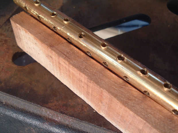 Cuando la broca sale del lado opuesto de la flauta de latón, habrá algunos intermitente o protuberancia del metal. He utilizado un medio, archivo de la mano para suavizar el flash.