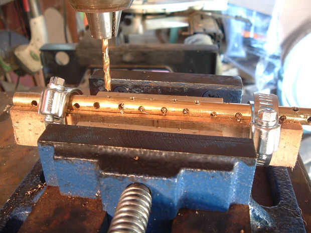 Esta foto muestra la flauta de latón 7" celebrada en el canal por Tornillo perno abrazaderas y un tornillo de banco taladro de columna. Los agujeros fueron perforados 1/2" de distancia, a través de ambas paredes de la tubería. Continuación, se gira el tubo de 90 º y alternando los orificios perforaron entre los agujeros ya existentes. Usé una broca de 1/8 y aceite para enfriar el metal caliente durante la perforación. La punta de la broca a veces se deslizó lateralmente en la flauta para que mis agujeros no alinean perfectamente... aunque todavía trabajan.