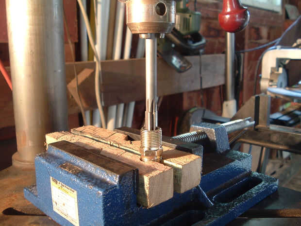 El espárrago tiene una dimensión interna (ID) de casi 3/8" pero el latón OD es precisamente 3/8" así que tuve que Escarie el tubo roscado. Colocar el tubo en el soporte de madera casero, pude fácilmente escariar un agujero perfecto 3/8" con abundante aceite de corte para mantener el frío metal.