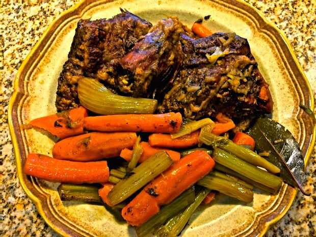 Agregue las zanahorias, apio, hojas de la bahía, y la mezcla de sopa. Vierta agua suficiente para cubrir completamente la carne