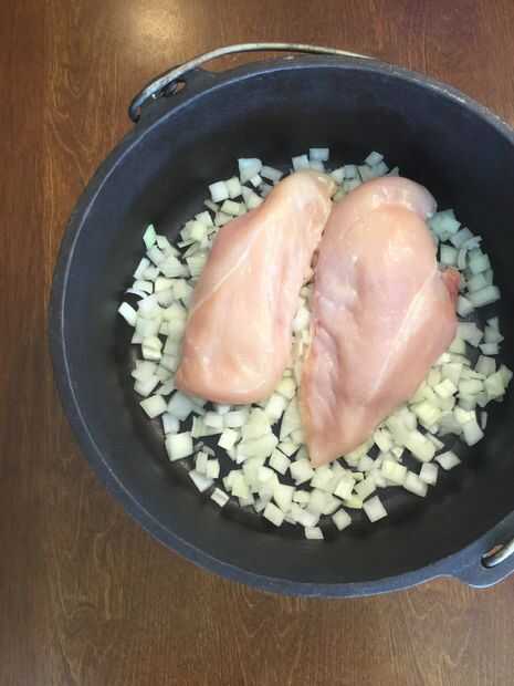 Coloque las pechugas de pollo sobre lecho de cebollas picadas.