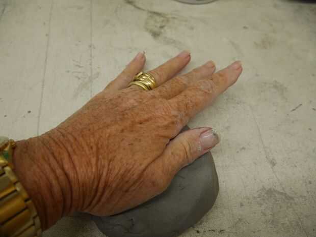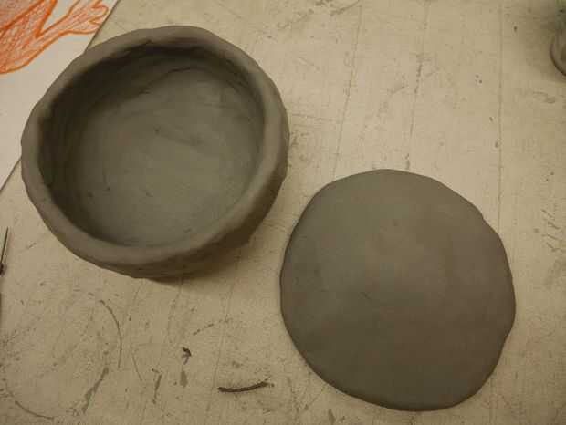 Otro pedazo de arcilla del tamaño de un limón grande tiene que rodar en una bola y luego presiona hacia fuera el tamaño del perímetro de la olla. La palma de la mano y tratar de mantener el mismo espesor de arcilla todo alrededor. Una vez que el tamaño es correcto poner la tapa al lado de la maceta, no en la parte superior, de lo contrario se cave!.