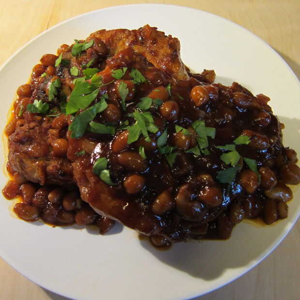 es una versión más sofisticada de frijoles y carne de cerdo que lo que comía cuando era un niño. Esta receta utiliza hueso cortado grueso de chuletas de cerdo en una salsa casera con garbanzos y judías norte una textura cremosa. Además, es una comida de una olla para fácil limpieza. Mis hijos prácticamente lamieron el plato limpio!