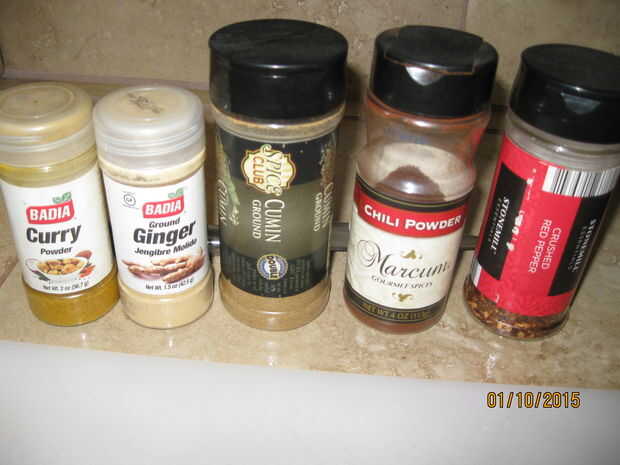 -Especias - Vuélvase Loco aquí. Usé el pimiento rojo, Chile en polvo, comino, curry, jengibre, sal y pimienta.