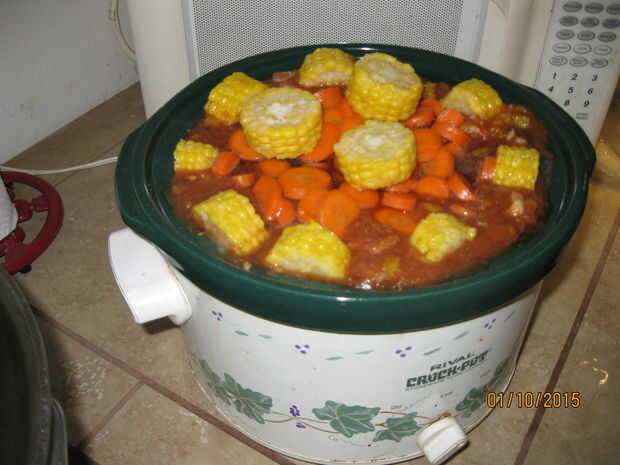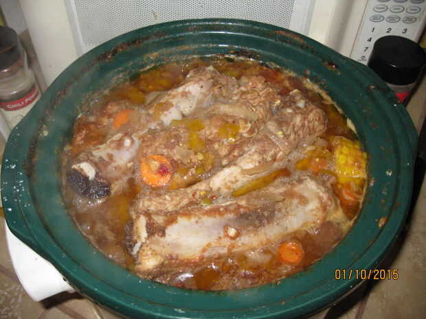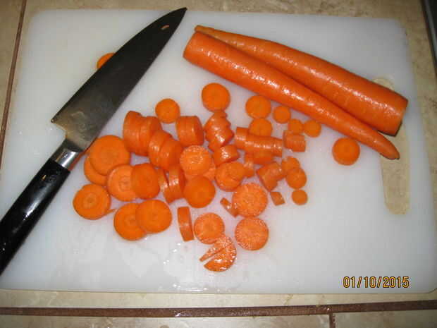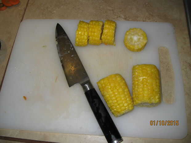 Las zanahorias y el maíz se come como un plato así que corte por consiguiente. Cuando corte las zanahorias ten en cuenta que la más gruesa la pieza, más tiempo tardará para cocinar. Si te gusta más suave verduras cortan más finas. Cortar el maíz en trozos que caben entre las costillas en la olla.
