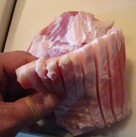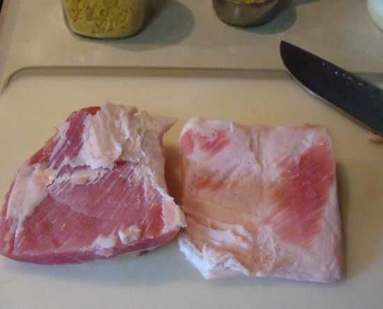 Cortar la carne de cerdo salada, separando la grasa de la carne.